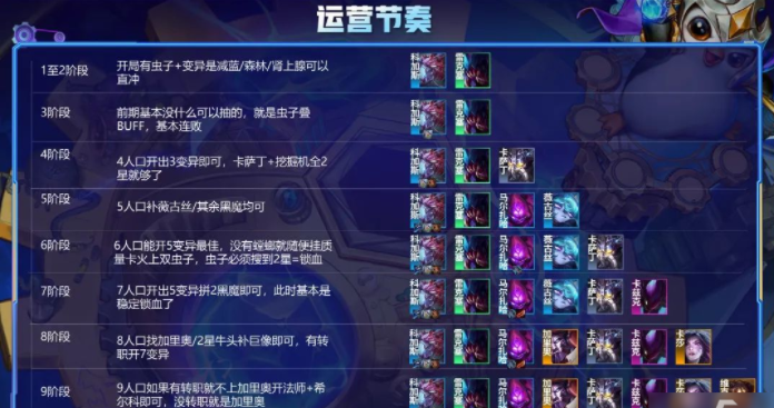阵容核心思路其实和普通模式相差无几,都是前期发虫子就是信号,因为人口数都一样,所以开局要玩虫子的话是一定没有连胜的,基本都是波波输,但是可以迅速积攒经济,速冲6人口开搜2星虫子锁血,而且前期主要目的局势滚雪球,让虫子叠BUFF抓紧叠起来,混到6人口开始动手,找到2星虫子基本锁血,有条件能摸到变异转或者螳螂就开出5变异,6人口书都打不赢我们,然后就是7人口慢慢找虫子的三星以及稳定开出5变异,上8人口运气好基本虫子可以三星,虫子三星是不用怕外面的2星4费的,所以8人口顶多掉一波血量,剩下事情就是上9人口开7变异以及找2星5费提升阵容上限的问题了,能活到9人口基本就是吃鸡局。