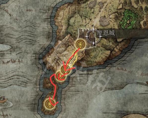 具体路线如下,沿着火点走就可以了,详细路线b站自行搜索“艾尔登法环 狮子混种 位置”。
