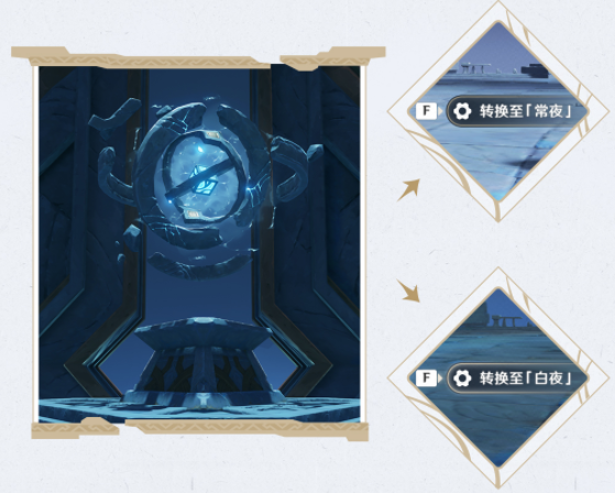 这种名为「日夜之台」的机关,改变「昼夜」后,也将会呈现不同的状态。 「日之台」与「夜之台」在对应的「昼」或者「夜」中会补齐自身,靠近之后就可以操作。但是转换「常夜」、 「白夜」后,它们的状态会重置。