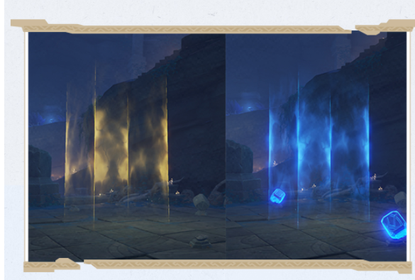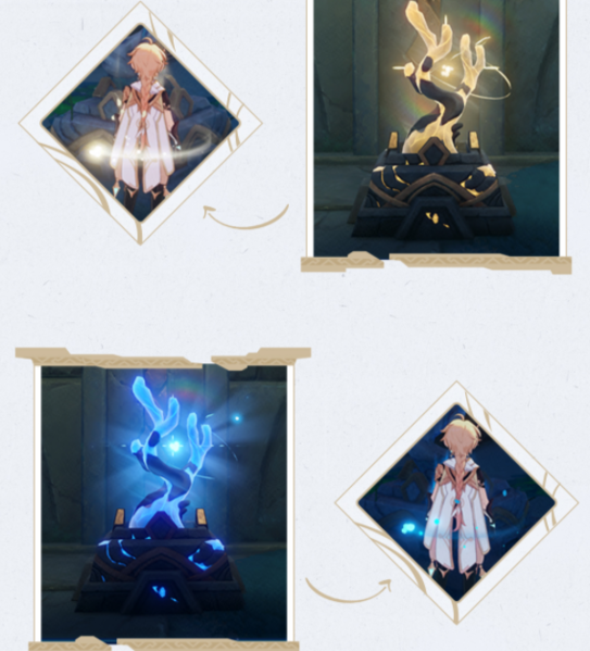 在渊下宫还有一种全新的机关,名为「精华拜受处」。拜受处分为日精和月华两种。它们分别可以储存「白夜」和「常夜」的能量,并加之拜谒者之身。可以使用这种能量,在相反的「昼夜」状态下激活机关。