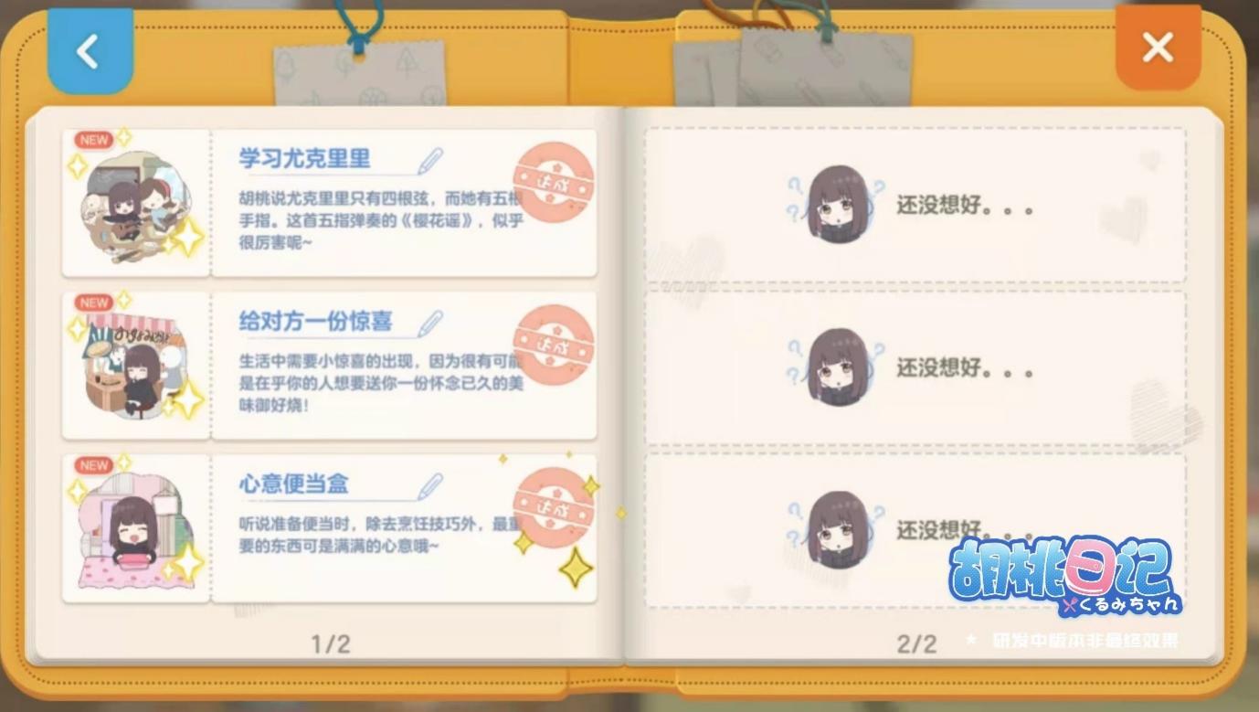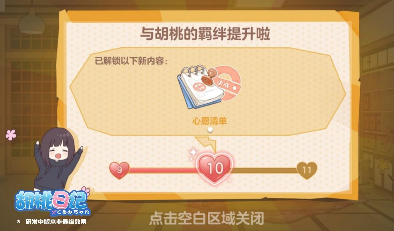 大家呼声很高的亲密度升级来了!亲密度升到10级后,将开启全新的“心愿清单”功能!胡桃在日常生活中经常会冒出许多千奇百怪的新想法,多亏有你的帮助,这些脑洞才会转化为小目标去一步步实现!胡桃会把这个过程全部记录在心愿清单中,你可以随时回顾这些美好点滴!