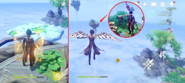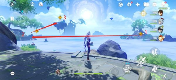 3.上图第3处点亮后,出现浮空石头,站上去跟着风场飞到小平台上(宝箱1)