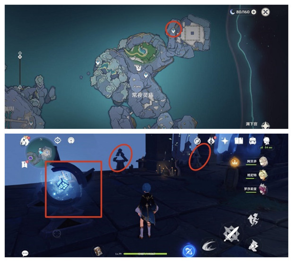 2.顺序乱的可以看一下正确的位置图。下去后激活水柱即可开门,对话领取任务