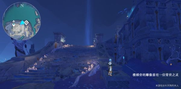 蛇心之地的图示地点,楼梯旁的雕像前有一位常世之灵;
