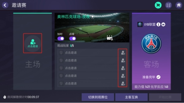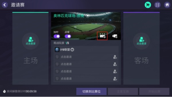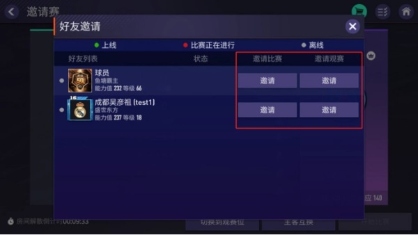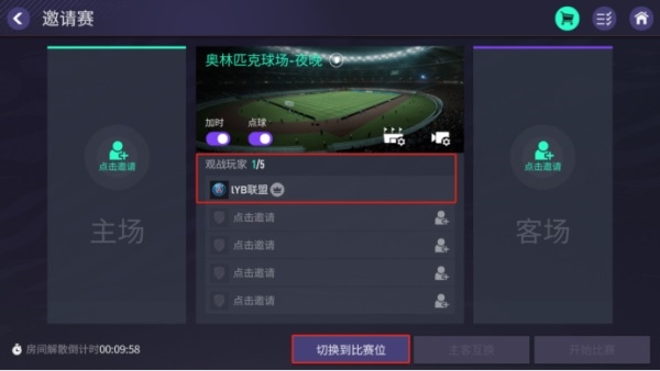 进入观察者模式后, 玩家作为邀请者自动落座于观战玩家中,可以邀请主客场各一名玩家,及其余四名观战玩家。与此同时,邀请者也可以切换到比赛位参与比赛。