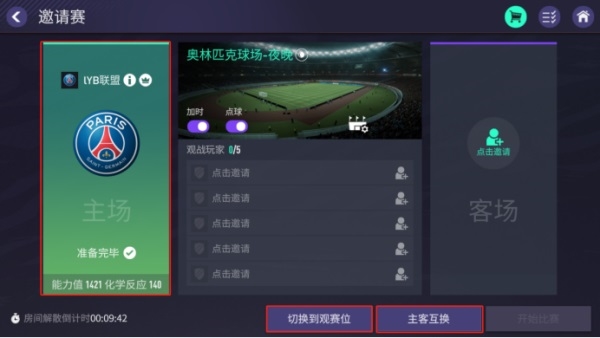 切换到比赛位后,邀请者玩家自动落座主场比赛选手位置,可以选择主客互换至客场比赛选手位置,也可以重新切换到观赛位,作为观察者观看比赛。
