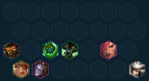 阵容不是很适合上九,有炼金、挑战相关转职可以上九开高炼金或是高挑战。后期需要针对阵容进行站位和吹风法衣针对,蛮王和对面C位站对角保证可以启动后第一个技能直接接近并秒杀后排。选秀找卡莎装备,后期卡莎作为副C补充伤害