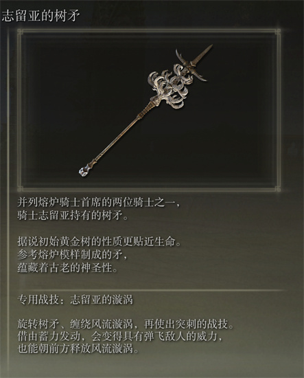 志留亚的树矛,面板主要是物理属性,面板很高。战技蓄满力有远程,伤害很高。