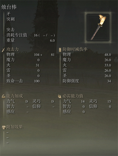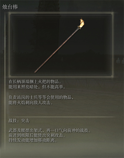 烛台棒,有照明作用。不能更换战灰,很长,当火把用不错,这把武器想要获得的话可以去史东薇尔城区域找那种举火把的流刑士兵,击杀这种敌人就有一定概率掉落。